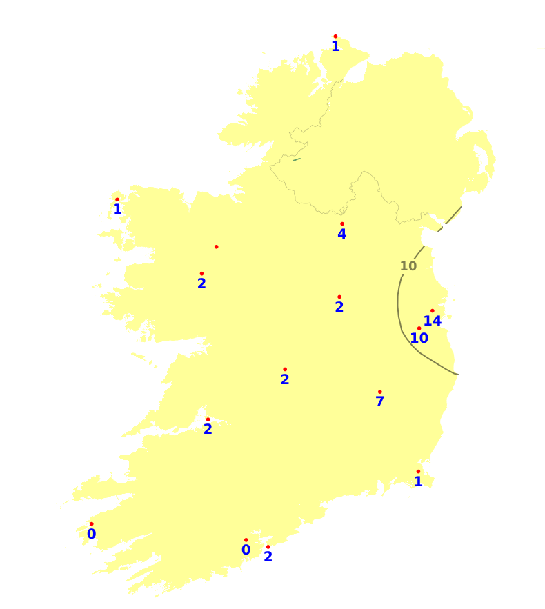 Rainfall amounts were below normal in most areas during the past week, except for small parts of west Connacht, southwest Munster and east Leinster. The highest accumulation of 41.7mm was recorded at Valentia (144% of average) and the lowest accumulation of 5.5mm was at Ireland West Airport, Knock (21% of average). The weather will be unsettled this week and rainfall is expected to be above normal nationwide, with two or three times the norm expected in some areas.
