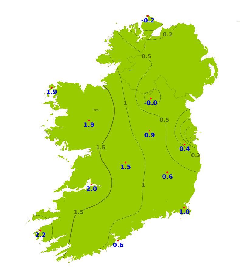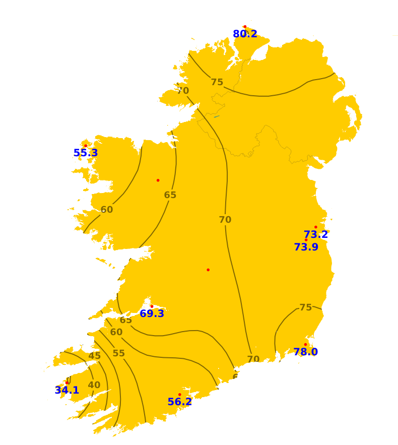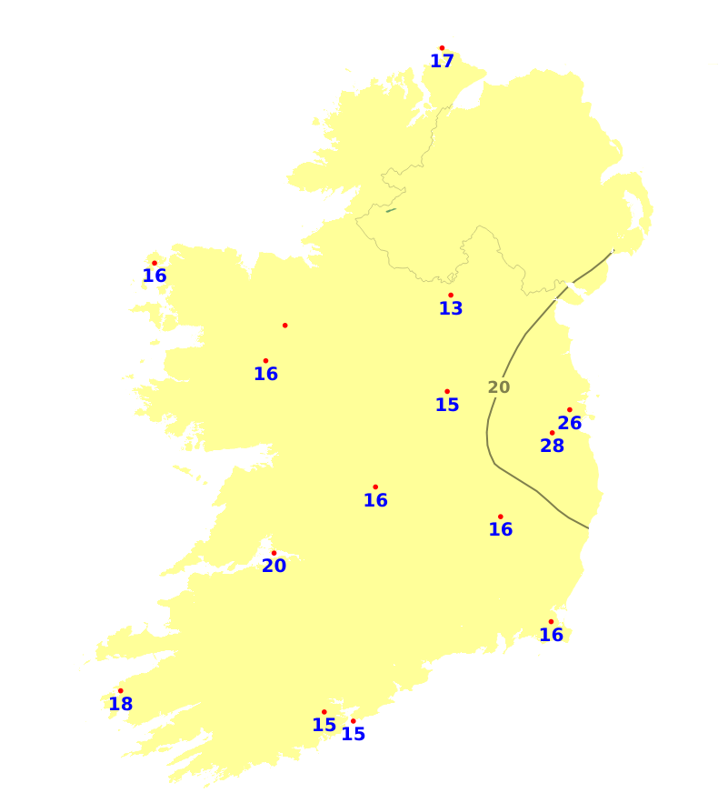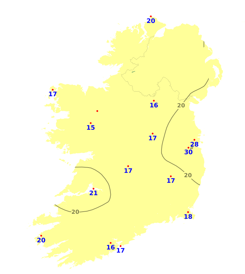 Mean air temperatures during the past 7 days ranged from 0.9 degrees below average to 1.7 degrees above average. The lowest mean temperature was 7.9 degrees recorded at Dublin Airport, (0.9 degrees below average). The highest temperature was 11.5 degrees recorded at Valentia Observatory, Co. Kerry (1.7 degrees above average). With plenty of sunshine forecast for the coming week, mean air temperatures are expected to be around 11 or 12 degrees around the country, which is 2 or 3 degrees above average. Mean soil temperatures were above average across the country during the past week by between 1.6 degrees and 2.9 degrees, and would be expected to remain above average for the coming week.