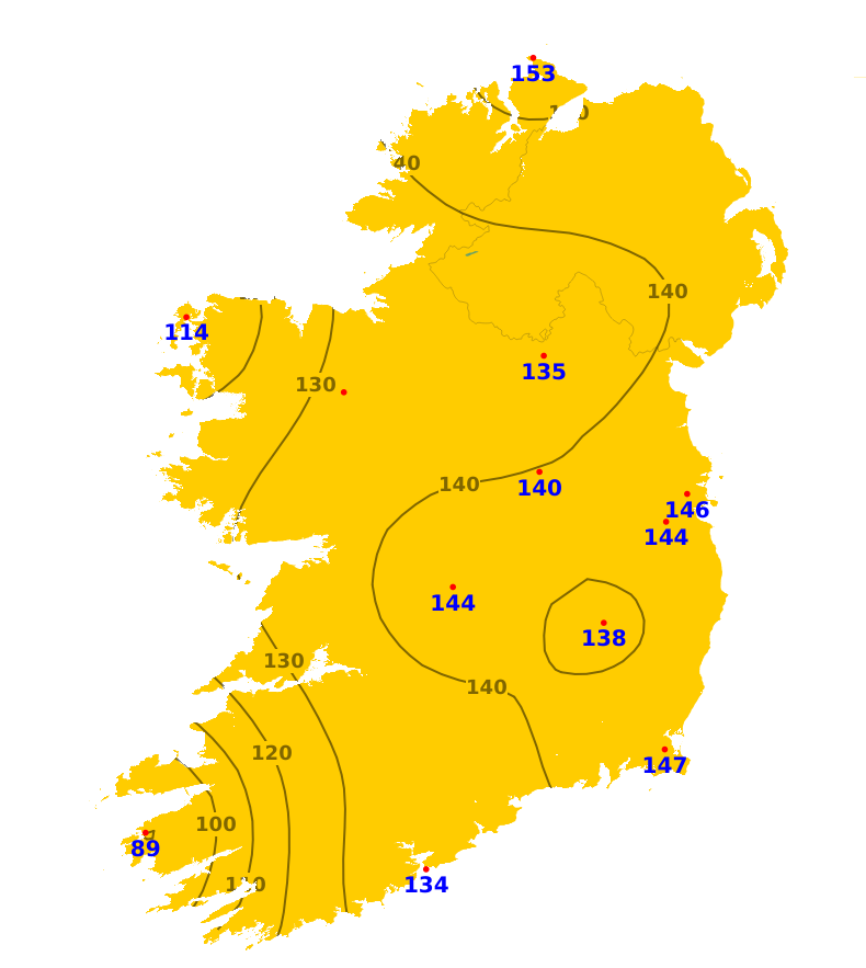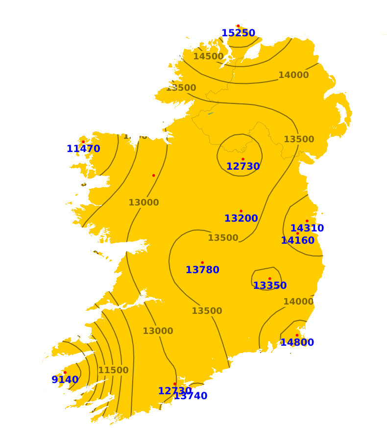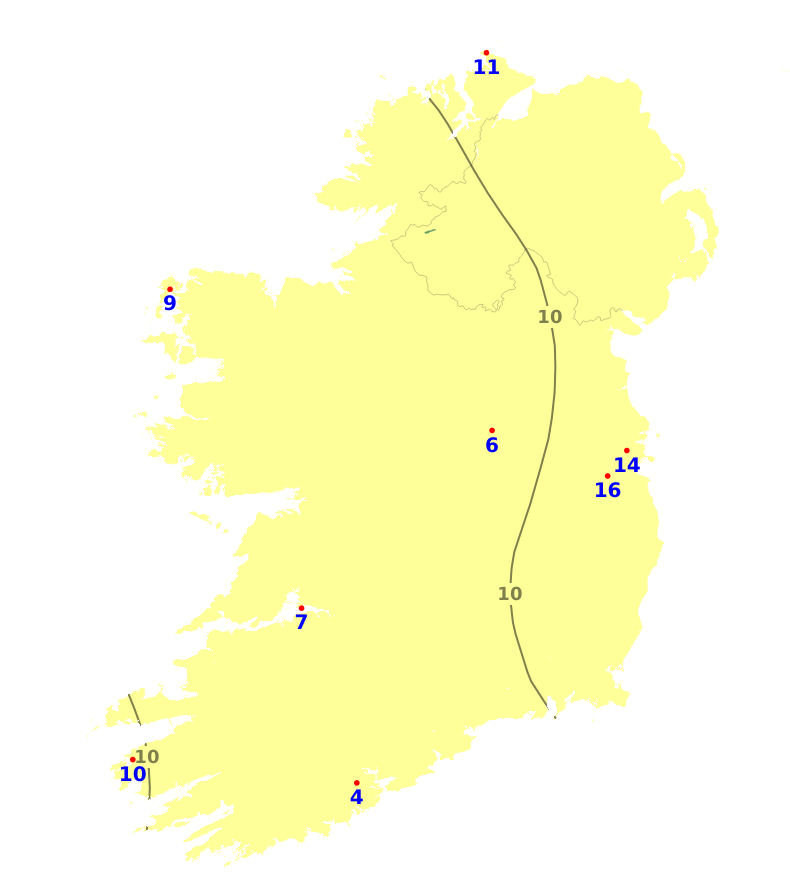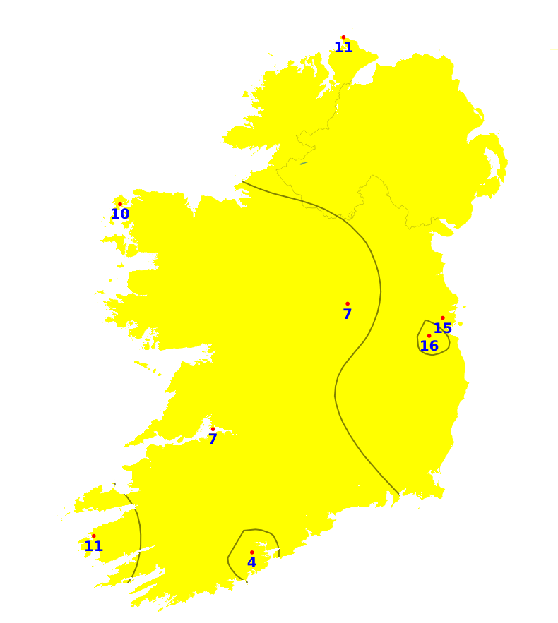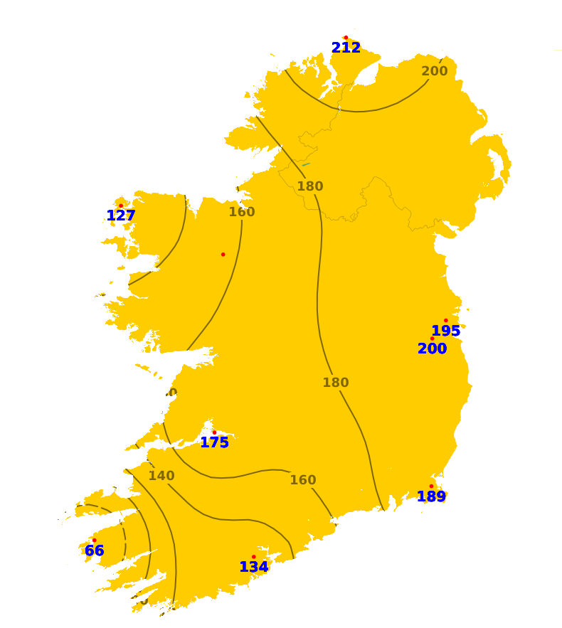Mean air temperatures during the past 7 days ranged from 0.9 degrees below average to 1.7 degrees above average. The lowest mean temperature was 7.9 degrees recorded at Dublin Airport, (0.9 degrees below average). The highest temperature was 11.5 degrees recorded at Valentia Observatory, Co. Kerry (1.7 degrees above average). With plenty of sunshine forecast for the coming week, mean air temperatures are expected to be around 11 or 12 degrees around the country, which is 2 or 3 degrees above average. Mean soil temperatures were above average across the country during the past week by between 1.6 degrees and 2.9 degrees, and would be expected to remain above average for the coming week.