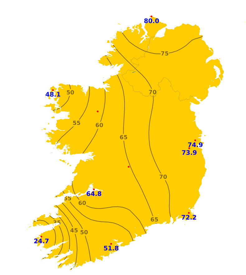 Sunshine amounts during the past week ranged from 92% to 214% of average. The most sunshine was recorded at Malin Head, Co. Donegal where there were 80.2 hours, or 214% of average. In contrast, 34.1 hours, or 92% of average, were recorded at Valentia Observatory, Co, Kerry. With plenty of sunshine forecast for the coming week, sunshine amounts would be expected to be above average across the country.