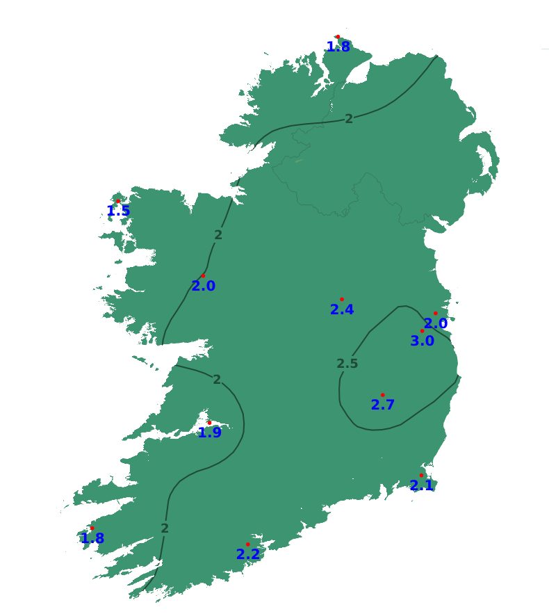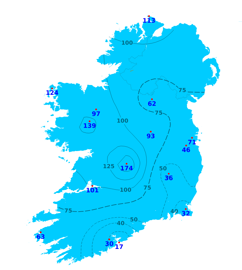 Over the past week, rainfall amounts were below average in southern parts of Munster and Leinster but were above average across the rest of the country. The highest accumulation of 50.1mm was recorded at Gurteen, Co. Tipperary, which is almost three times the norm for this location. The driest location was Roches Point, Co. Cork, with an accumulation of 5.9mm. Generally settled weather is forecast until later on Monday, when a change to rain and showers is expected. Rainfall in the next seven days is forecast to be near or above normal in west Connacht and northwest Ulster, but below normal across the rest of the country. The driest conditions are expected in the south and southeast.