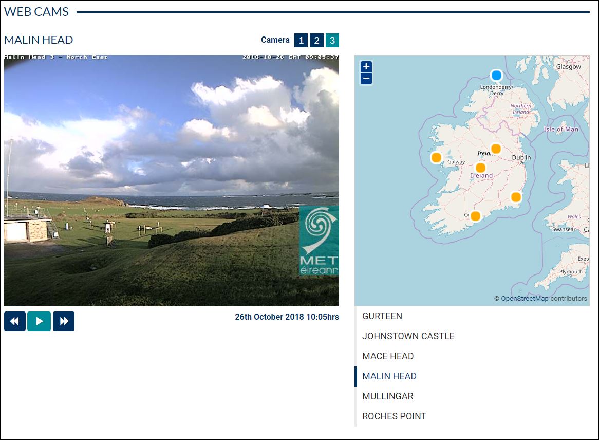 There are 20 fully automatic weather stations across the country recording meteorological elements on a minute-by-minute basis. 6 of these weather stations have 3 sets of web cams, generally facing north, southeast and southwest. Select webcam by clicking on the station on the map or click on the list below. They play a 1-hour animation loop of images at 5-minute intervals and this can show very interesting weather events such as cumulonimbus clouds and weather fronts passing. They are installed at a height at our weather stations at Malin Head, Mullingar, Mace Head, Gurteen, Johnstown Castle and Roches Point.