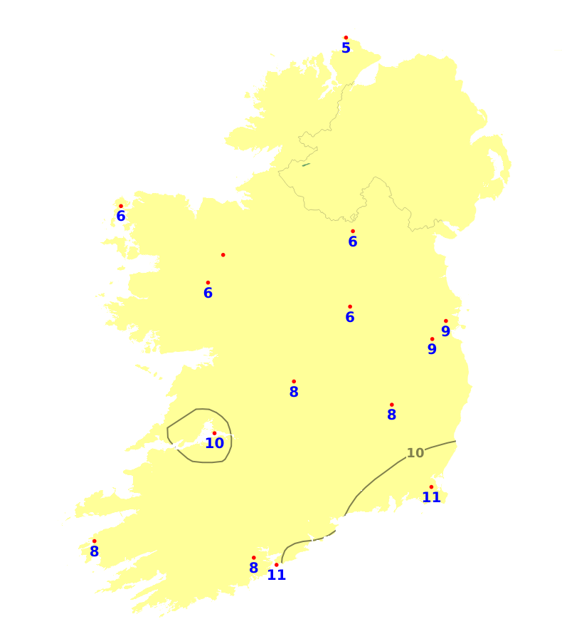 Sunshine remained well below normal last week. The dullest stations were Shannon Airport and Valentia with 0.0 hours (0% of normal) and Johnstown Castle 0.2 hours (1%), while Claremorris recorded the highest at 1.1 hours (4%). Cloud cover is expected to persist this week, keeping sunshine amounts below normal.