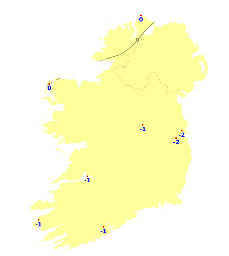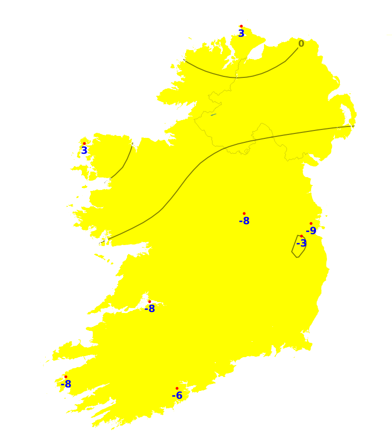 Mean air temperatures over the past week were mostly above average, ranging from 5.2 degrees at Knock/Ireland West Airport, Co. Mayo and 7.3 degrees at Roche's Point, Co. Cork which equates to between 0.6 degrees below at Valentia Observatory, Co. Kerry and 1.5 degrees above at Mullingar, Co. Westmeath. Mean soil temperatures have been above normal throughout the country, ranging from 5.1 to 6.6 degrees which is between 0.1 and 2.2 degrees above the average. Over the coming week, mean air temperatures will likely be close to normal. Mean soil temperatures will likely continue above normal but may decrease slightly.