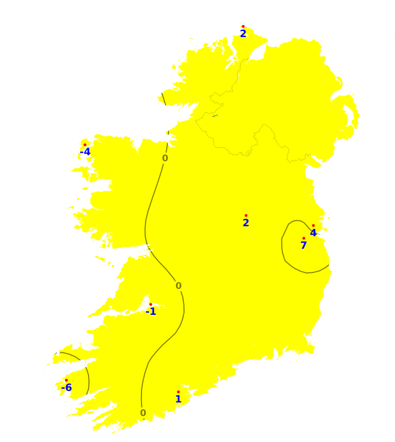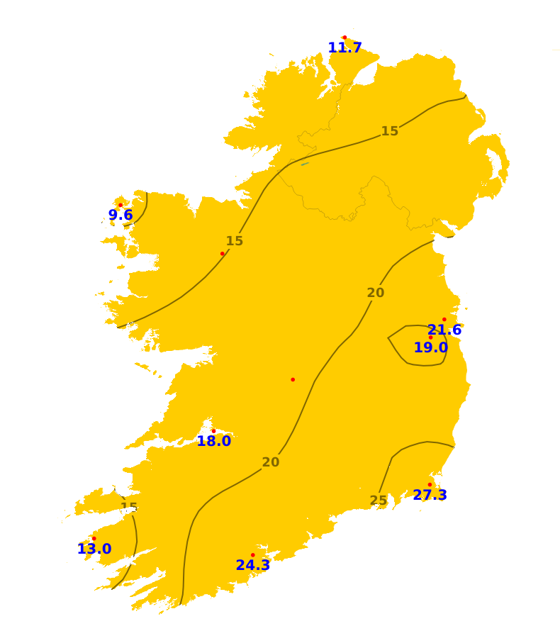 Sunshine amounts were above normal for most areas over the past week, though they were slightly below normal in the west and northwest. The least sunshine was recorded in the north with 8.8 hours of sunshine recorded at Malin Head, Co. Donegal (93% of average). It was brightest in the southeast with 27.4 hours recorded at Johnstown Castle, Co. Wexford (229% of average). With more unsettled conditions in the week ahead, sunshine amounts are likely to decrease to below normal.