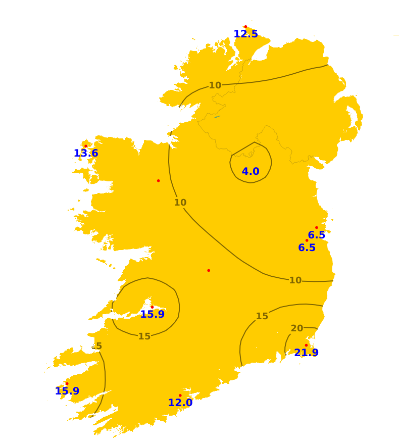 Rainfall amounts have been well below normal across the country over the last seven days. Amounts ranged from just 0.2 mm at Valentia, Co. Kerry (1% of normal) to 6.7 mm at Cork Airport (41% of normal). High pressure will dominate for much of the coming week, bringing largely dry conditions for a time, though there'll be some rain, drizzle and showers later in the week, which will turn wintry at times, especially further north. Precipitation amounts will be low generally, a little higher in some northern parts later in the week. There'll be little or no precipitation in the southeast, and with only between 2mm and 10mm in many other areas, which equates to less than 30% of normal. In parts of the west and southwest, up to 15mm can be expected, or between 30% and 50% of normal, while up to 20mm is forecast for the north, equating to around 75% of normal.