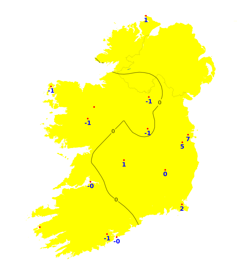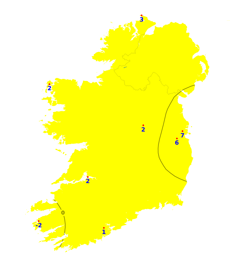 Mean air temperatures were also well below average nationwide over the past week, ranging from 1.3 degrees recorded at both Casement Aerodrome and Dublin Airport to 5.6 degrees recorded at Bellmullet, Co. Mayo. This equates to between 0.8 and 4.1 degrees below average for the time of year. Mean soil temperatures have been close to or below normal, ranging from 1.6 to 5.1 degrees. Over the coming week, mean air temperatures will likely be close to or slightly above normal, with mean air values of between 4 and 7 degrees generally, possibly reaching up to 10 degrrees in the southwest. Mean soil temperatures will remain similar or may increase slightly in a few locations.