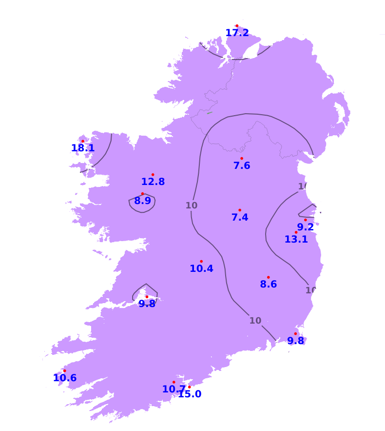 Sunshine amounts for most areas over the past week were generally above average with the exception of the west Connacht coast. Sunshine hours ranged between 12.3 to 17.5 hours for most (120 to 200% of normal) with Malin Head, Co. Donegal recording the most, with 17.5 hours. Belmullet, Co. Mayo recorded the least amount of sunshine this week, with just 6.4 hours which is 73% of its average. While there will be good sunny spells at times, generally mixed and unsettled conditions are expected until around midweek next week before more settled, and hopefully sunnier, conditions develop. Sunshine amounts will likely decline to around