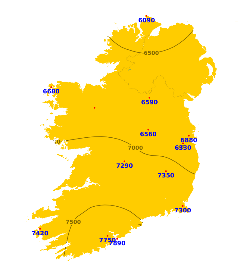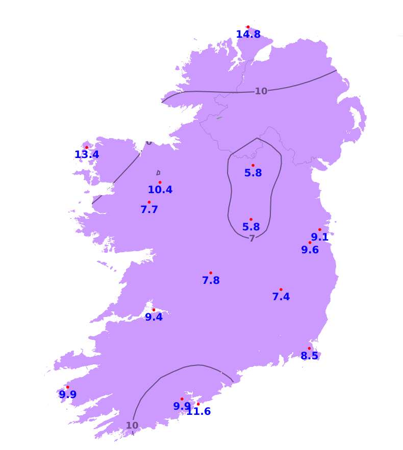 Mean air temperatures were generally around or slightly below average during the past week. The highest mean air temperature was 8.5 degrees recorded at Valentia Observatory, Co. Kerry. The lowest mean air temperature was 6.4 degrees (approximately average) recorded at at Ballyhaise, Co. Cavan. Mean soil temperatures were also above average during the past week by between around 2 and 3.5 degrees. Mean air temperatures are expected to be a degree or so above average for the coming week, ranging from 8 to 10 degrees. Mean soil temperatures are also expected to remain above average for the coming week.