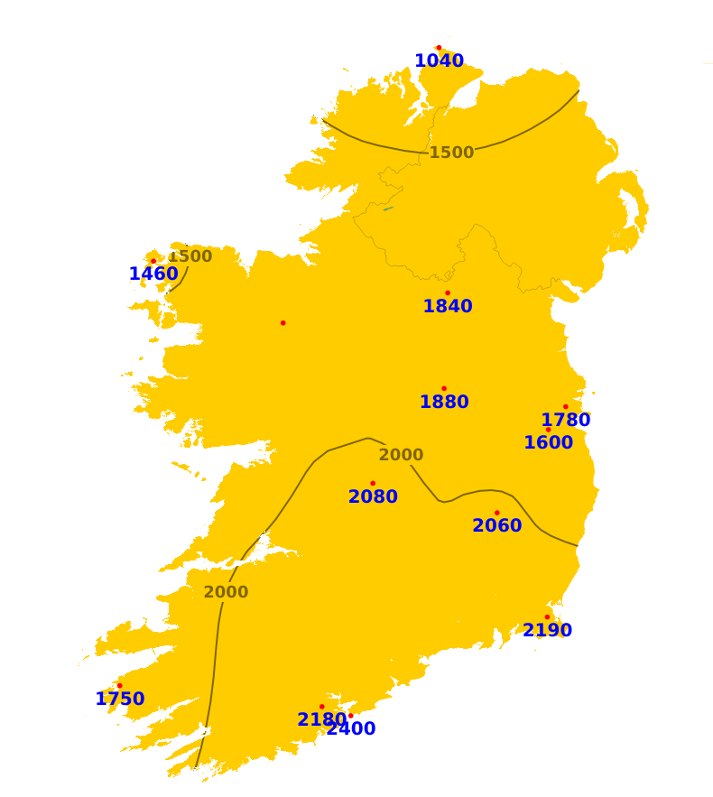 Sunshine amounts were above normal countrywide over the past week. Northern and western parts recorded closer to average values with Malin Head recording 10 hours (106% of its average). However most other areas received around twice the average amount of sunshine. Indeed Johnstown Castle, Co. Wexford, received 31.7 hours of sunshine, equating to 266% of average. Mixed conditions over the week ahead will likely lead to near or below normal sunshine amounts.