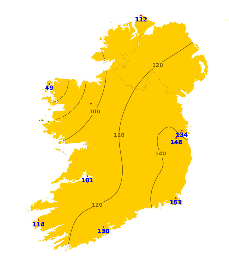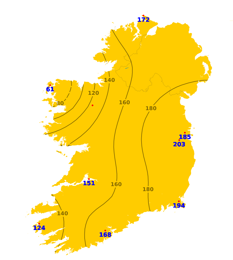 Rainfall amounts varied across the country during the past seven days. Amounts were above normal in the west, southwest, east and parts of the midlands. In other areas, amounts were a little below normal. The wettest location was Valentia, with an accumulation of 68mm, and the driest was Casement Aerodome, recording an accumulation of 14.8mm. Over the next week, there will be rain or showers at times, with drier spells in between. Rainfall is forecast to be quite varied with coastal areas getting nearly 1.5 to 2 times the average but inland areas about average to below average.