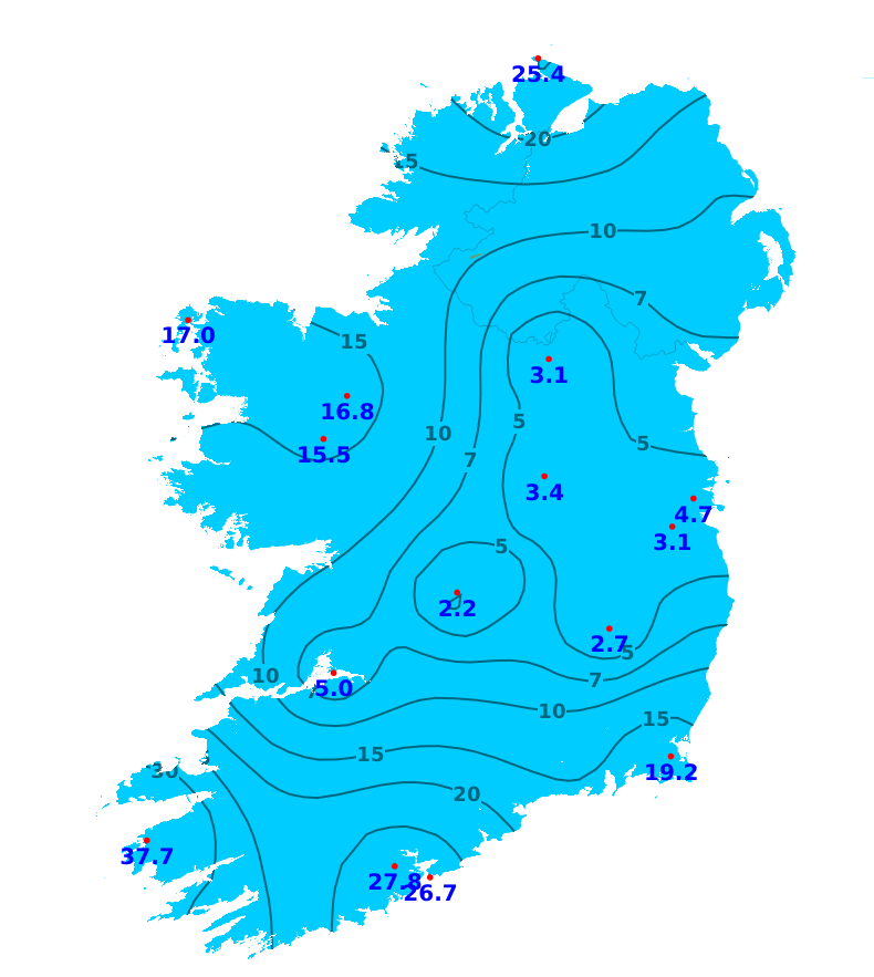Over the past seven days, rainfall amounts have been generally below normal across the country. Rainfall amounts generally ranged between 10% in the midlands to 80% near coasts. Accumulations were slightly higher near south and southwest coasts at 90 - 120% of average. Valentia Observatory, Co. Kerry, recorded the highest rainfall with 38.1mm recorded there. The lowest rainfall was recorded at Gurteen, Co. Tipperary, with 2.2mm there. Conditions will be more unsettled in the coming week with more frequent spells of rain and showers. It will be wetter than average nationwide with rainfall amounts forecast to be up to 2 or 3 times the normal. The wettest conditions will be in the southwest.