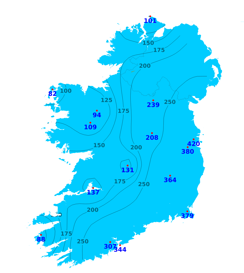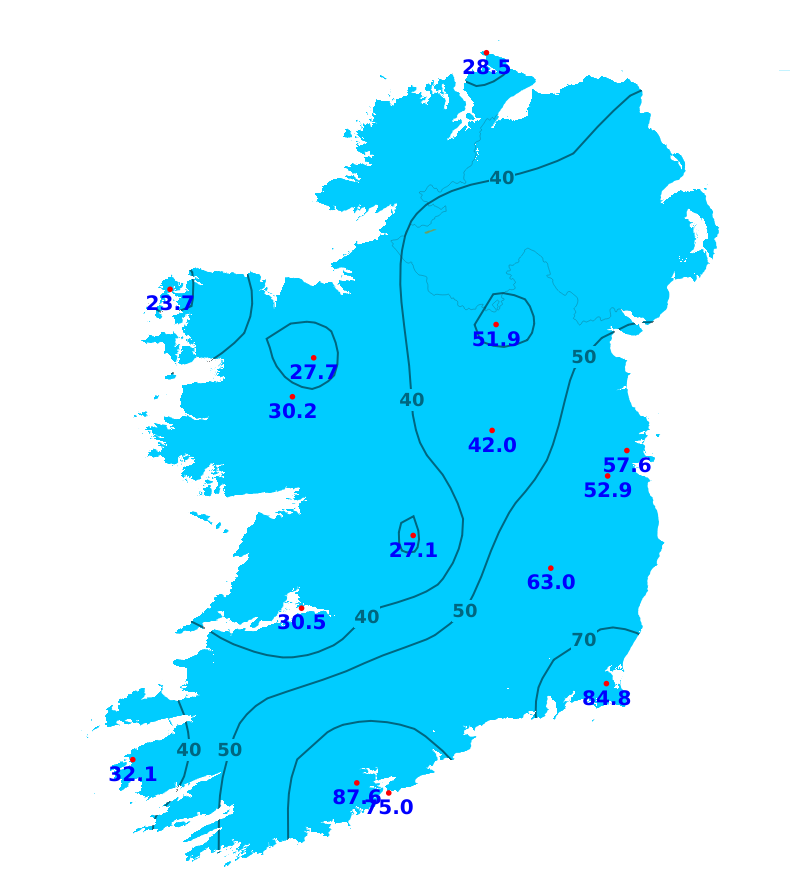 Sunshine amounts were generally below average with the exception of the southwest coast. It was brightest in Valentia Observatory, Co. Kerry with 12.8 hours of sunshine recorded there (114% of average). It was dullest near eastern coasts with just 1.6 hours of sunshine recorded at Dublin Airport (11% of average). The coming week will be unsettled with generally cloudy conditions so sunshine totals are likely to be below normal.