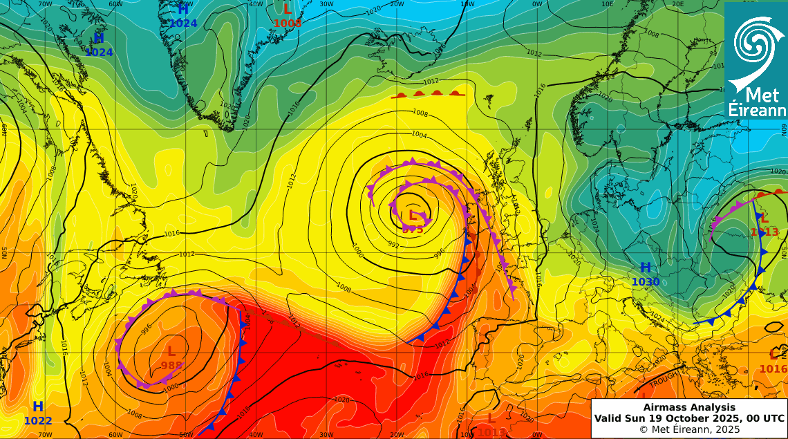 Airmass Analysis (850hPa Wet Bulb Potential temperature, Surface Pressure & Fronts) at 00UTC Dé Domhnaigh 19 Deireadh Fómhair 2025