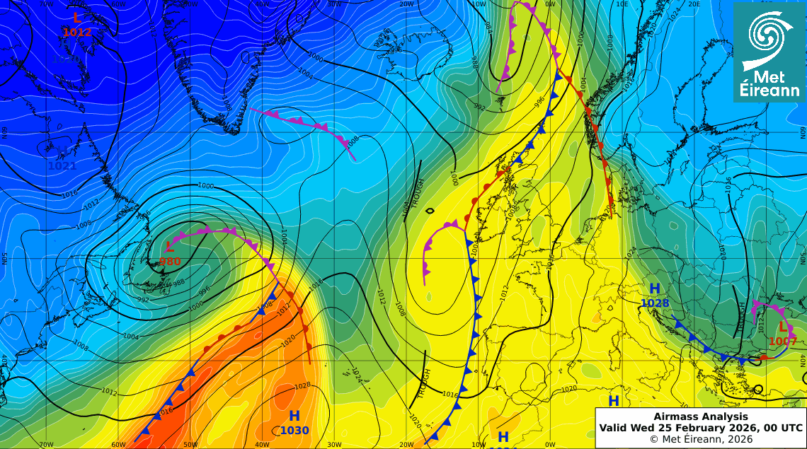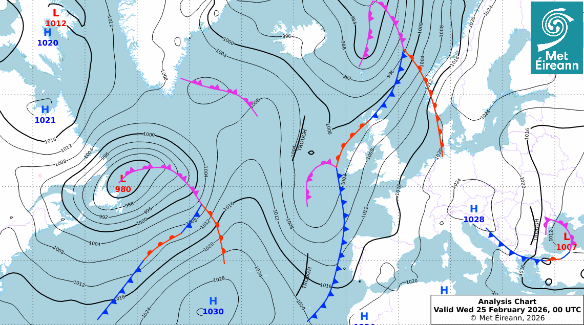 Surface Pressure & Frontal Analysis at 00UTC Dé Céadaoin 25 Feabhra 2026