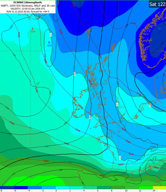 Met Éireann is forecasting a cold and wintry start to the new year as a northerly air-flow becomes established over Ireland, drawing down polar air across the country. Temperatures are expected to fall below average, with the main impacts being frosty and icy nights. There will also be some sleet and snow showers at times, mainly affecting Ulster and north Connacht, while many other areas will experience crisp, bright conditions with plenty of winter sunshine.