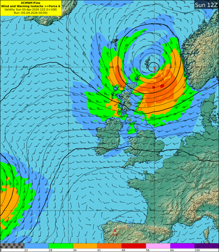 Figure 5 ECMWF model showing predicted wind speeds for Saturday