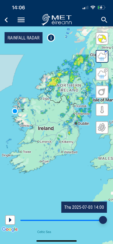 - Rochtain níos éasca ar léarscáileanna agus réamhaisnéisí cruinne báistí ar aip agus ar shuíomh gréasáin Met Éireann.