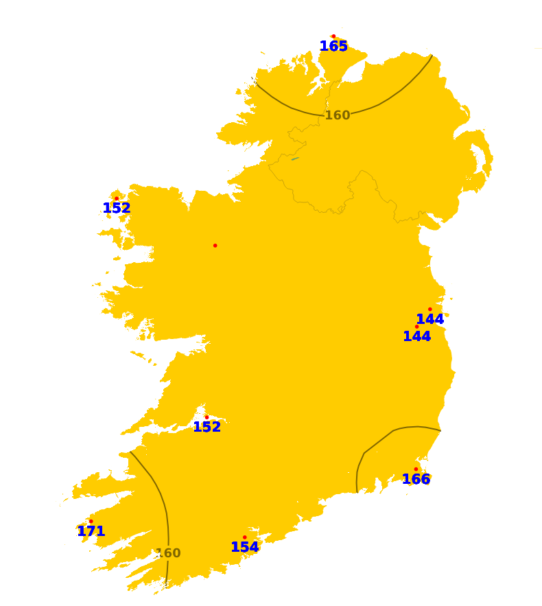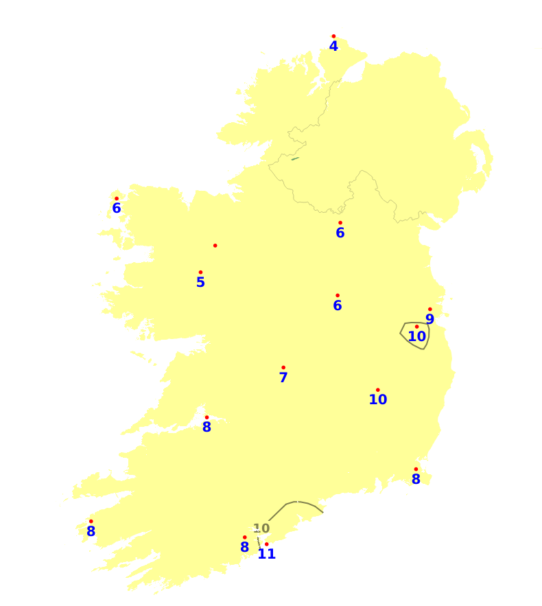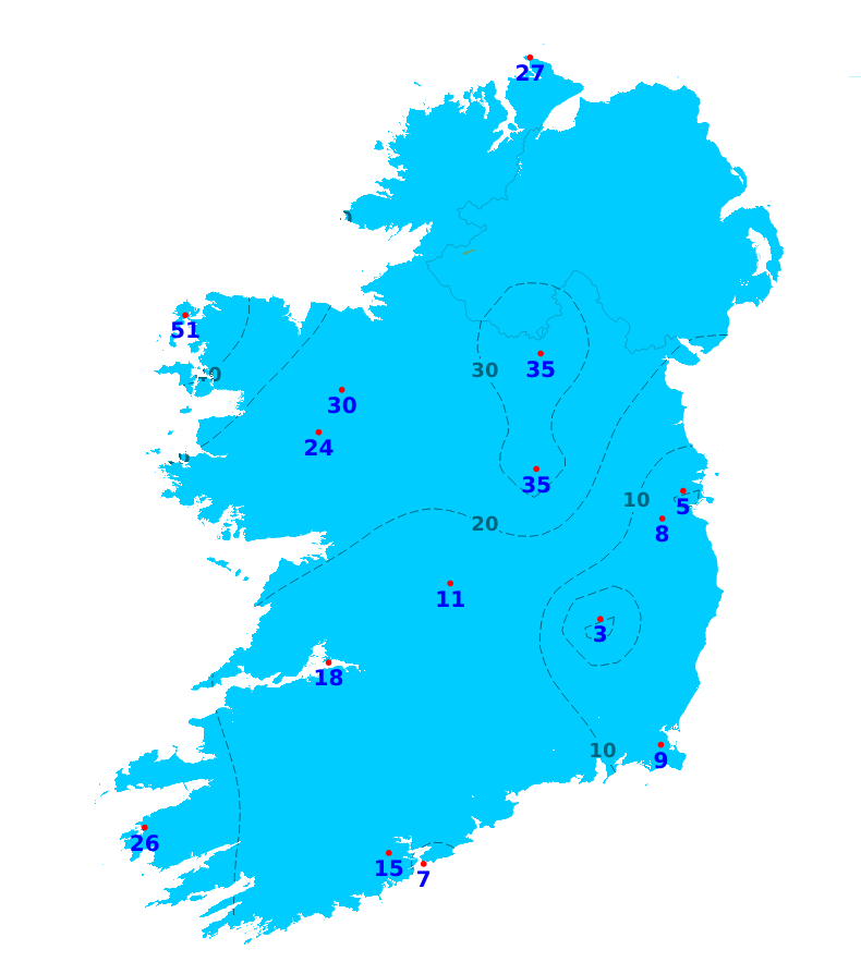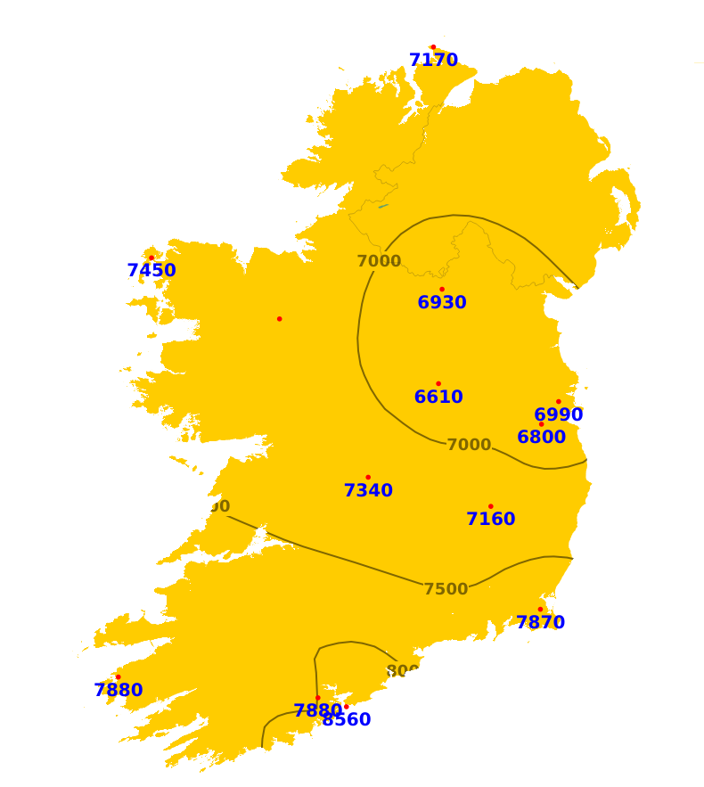 It was sunnier than average nationwide over the past week, with sunshine amounts ranging between 144 and 171% of average. Both Gurteen, Co. Tipperary, and Belmullet, Co. Mayo, recorded the least with 36.2 hours while Johnstown Castle, Co. Wexford recorded the most with 42 hours. The more unsettled conditions over the coming week will mean a reduction in sunshine amounts but there still will be good sunny spells at times. Overall, sunshine amounts will likely be near or below normal with southern and southeastern areas likely to experience the most.