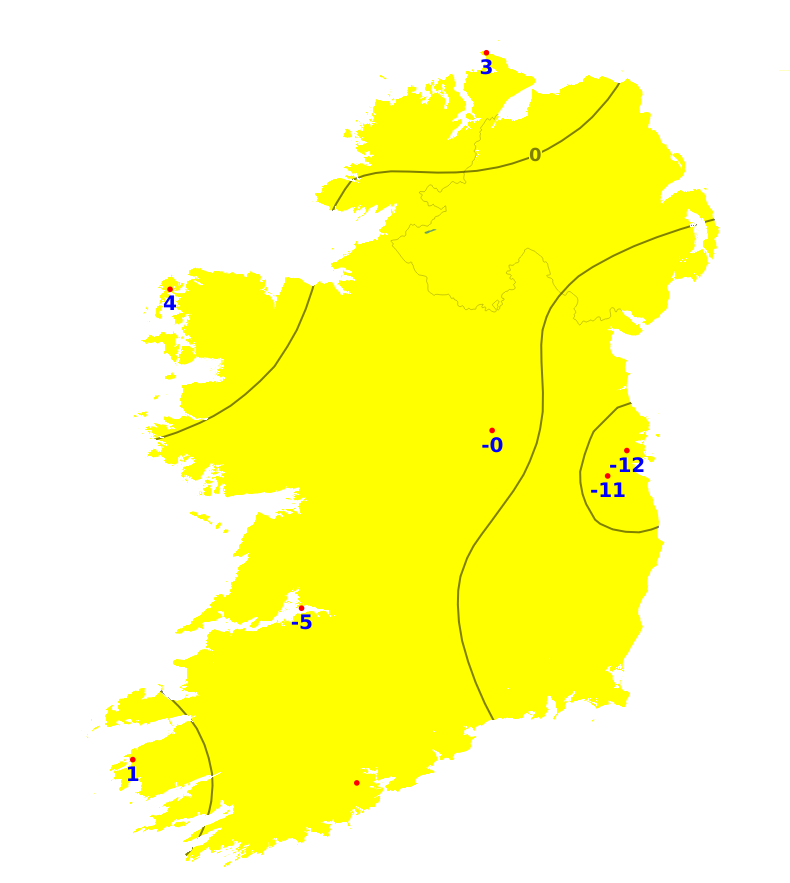 The past week has been much wetter than average, with rainfall amounts between 1.5 and 4 times the average for the time of year. The wettest station was Gurteen, Co. Tipperary, where 85 mm of rainfall was recorded (399% of its average). Dublin Airport, Co. Dublin, had the lowest rainfall total, with 43.9 mm recorded there (256% of average). The coming 7 days will start see a change to our overall weather regime with drier to near normal amounts of rainfall. It will be driest in the far south of Munster while wettest across the far north of Ulster. Rainfall amounts will vary significantly across the country. Parts of the south will see less than half of average but across the far north will see more than 1.5 times average.