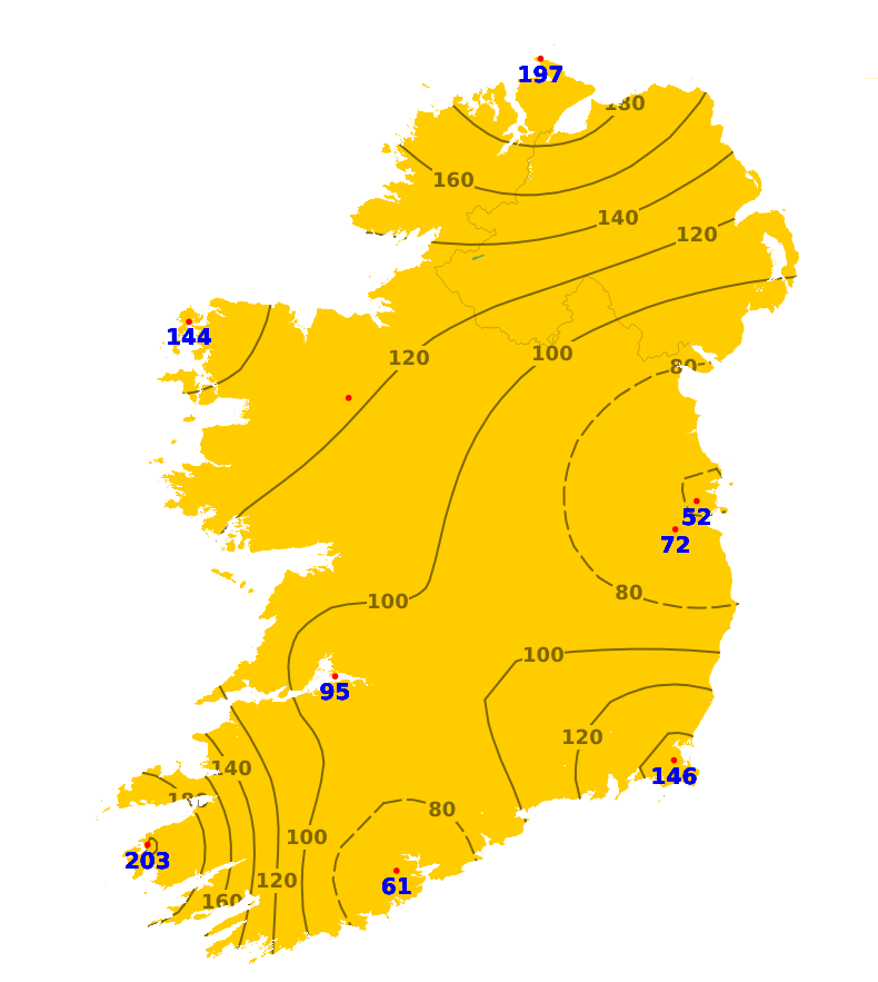 Rainfall amounts have been below normal across the country over the last seven days. Amounts ranged from just 3.7 mm at Dublin Airport (23% of normal) to 19.2 mm at Cork Airport (64% of normal). With high pressure dominating for much of the coming week, there is little to no rainfall forecast, with just occasional spots of drizzle. Later next week a little rain, drizzle and some showers will move down from the north, but overall rainfall amounts for the week ahead will range from 0 mm in some southern parts to 9 mm or 34% of average in the north.