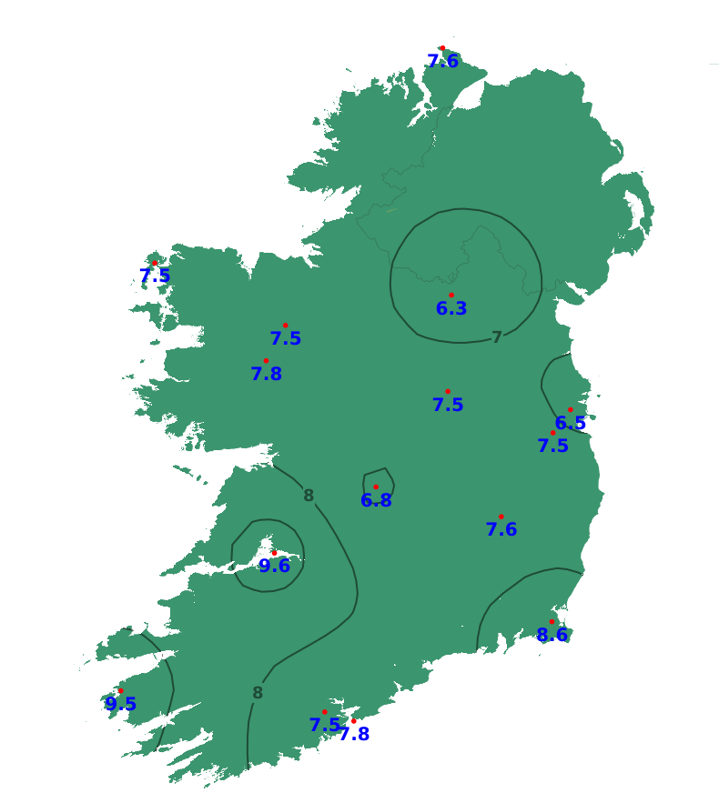 Sunshine amounts varied across the country over the past week, with some northern and northwestern parts seeing a little below average, while it was brighter elsewhere with generally higher than average sunshine amounts recorded. Malin Head, Co. Donegal, recorded the least amount of sunshine, with 10.5 hours or 93% of average recorded there, while it was sunniest at Cork airport, where 27.7 hours or 174% of average sunshine was recorded.Our weather will be mixed over the next seven days, with cloudier wetter spells and some drier and brighter interludes too. Overall, sunshine totals for the coming week are likely to be close to or slightly above average.
