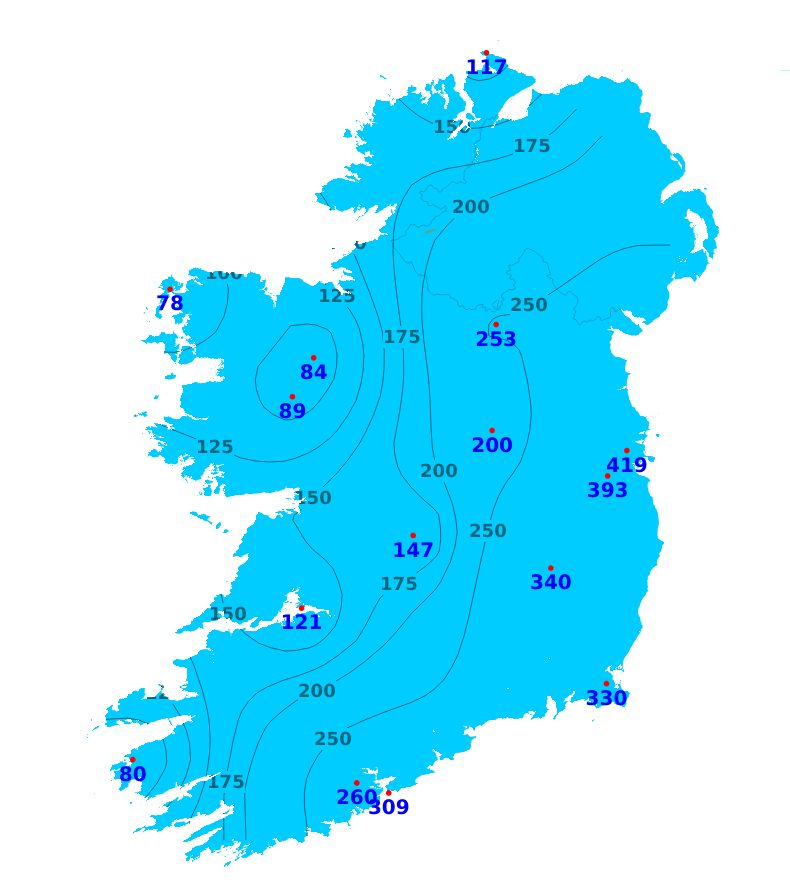 Sunshine amounts were generally below average with the exception of some western and southwestern coasts. It was brightest near southwestern coasts with 15.9 hours of sunshine recorded at Valentia Observatory, Co. Kerry (144% of average). It was dullest near eastern coasts with just 1.5 hours of sunshine recorded at Dublin Airport (10% of average). The coming week will be unsettled with generally cloudy conditions so sunshine totals are likely to be below normal.
