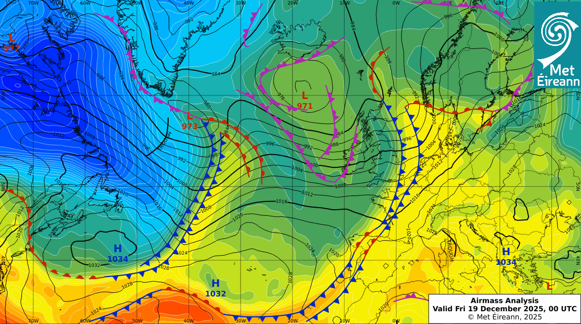 Airmass Analysis (850hPa Wet Bulb Potential temperature, Surface Pressure & Fronts) at 00UTC Friday 19 December 2025