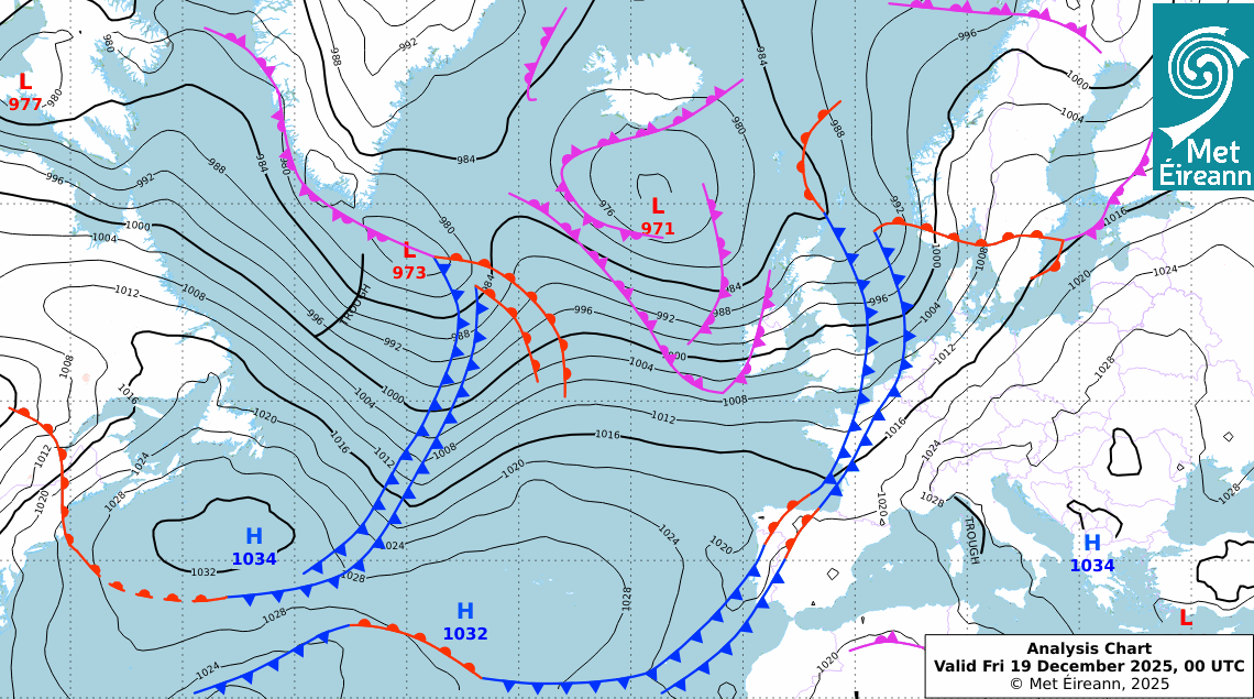 These analysis charts show the surface pressure pattern over the North Atlantic and Europe at 00UTC today. They display isobars (lines of equal pressure) and indicate areas of high (H) and low pressure (L) along with their central pressure value. Isobars are represented by solid black lines every 4 hPa with the thicker isobars every 16 hPa. High pressure is usually associated with mainly dry, settled weather with light winds while low pressure is normally associated with unsettled weather which is often wet and windy. The lower the pressure generally the stronger the winds and the heavier the rain (a hurricane being the most extreme example). Fronts are the boundary between different airmasses; a cold front is blue, a warm front is red and an occlusion is purple. Climate of Ireland