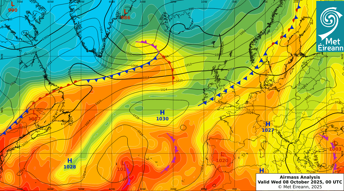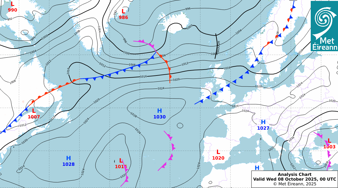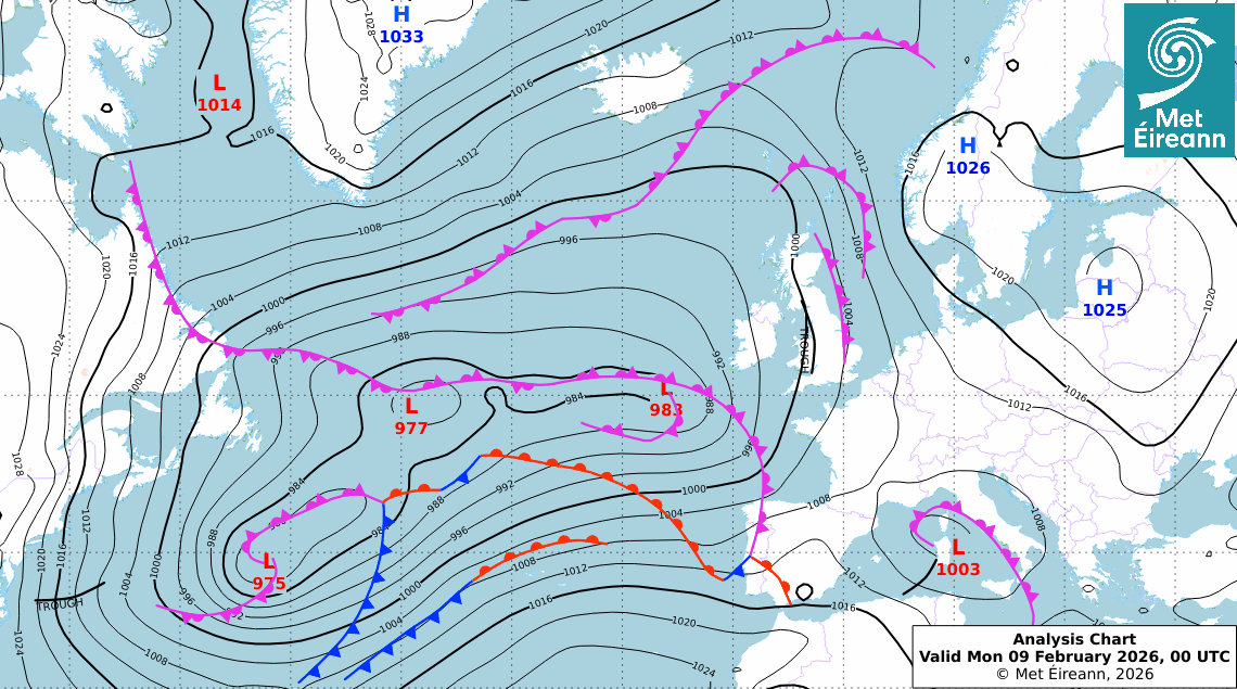 These analysis charts show the surface pressure pattern over the North Atlantic and Europe at 00UTC today. They display isobars (lines of equal pressure) and indicate areas of high (H) and low pressure (L) along with their central pressure value. Isobars are represented by solid black lines every 4 hPa with the thicker isobars every 16 hPa. High pressure is usually associated with mainly dry, settled weather with light winds while low pressure is normally associated with unsettled weather which is often wet and windy. The lower the pressure generally the stronger the winds and the heavier the rain (a hurricane being the most extreme example). Fronts are the boundary between different airmasses; a cold front is blue, a warm front is red and an occlusion is purple. Climate of Ireland