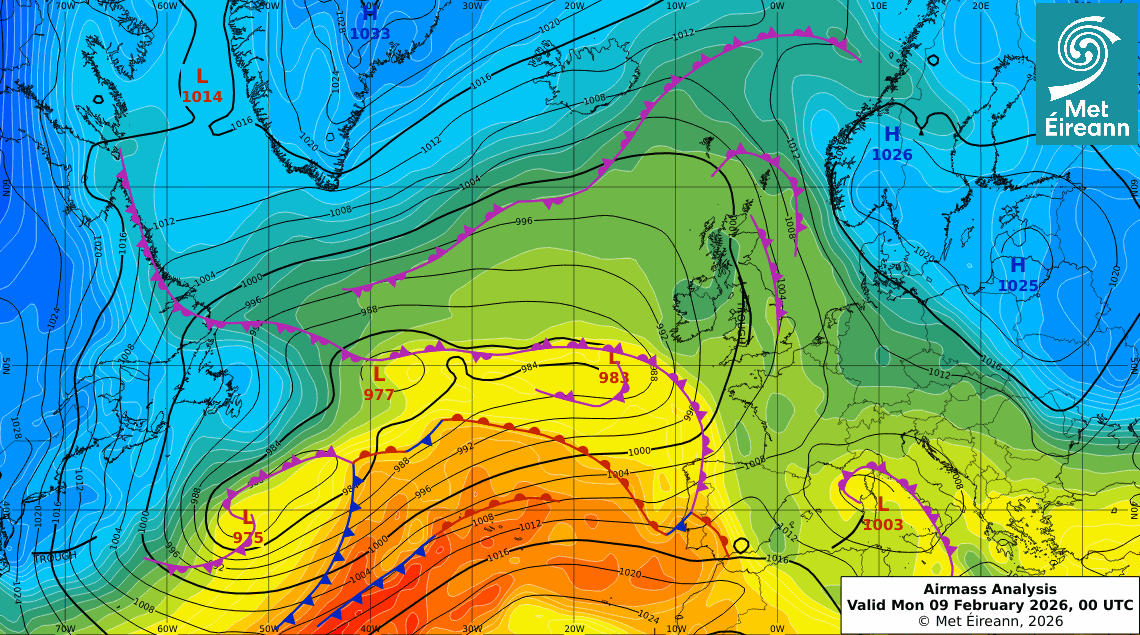 Airmass Analysis (850hPa Wet Bulb Potential temperature, Surface Pressure & Fronts) at 00UTC Monday 09 February 2026