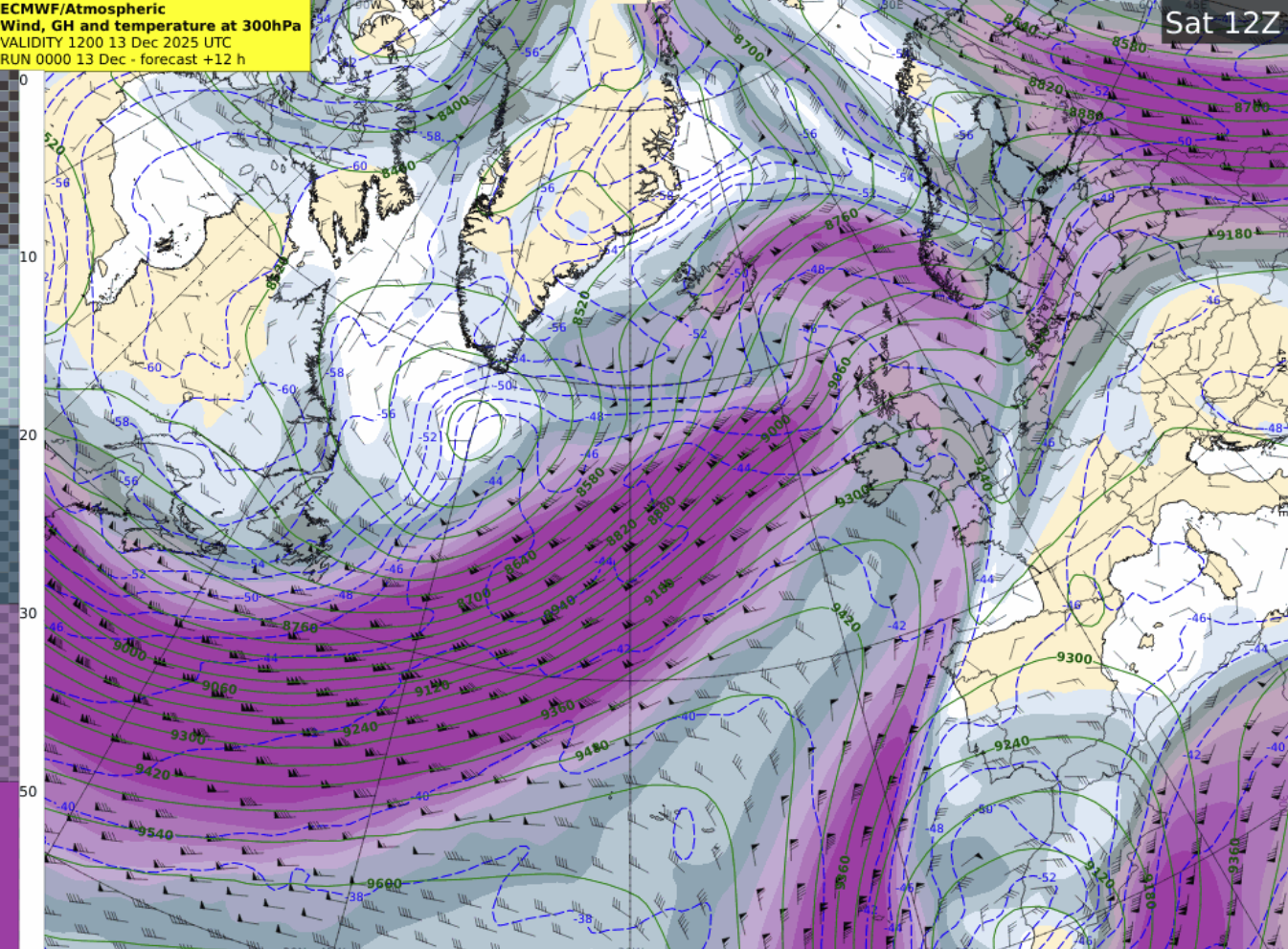 Figure 1: The current ECMWF model prediction of the position of the jet stream at 12 noon Saturday 13th December