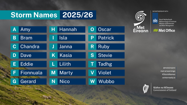 Met Éireann, the UK Met Office and KNMI publish a new list of storm names for each Storm Season, which commences on 1st September.