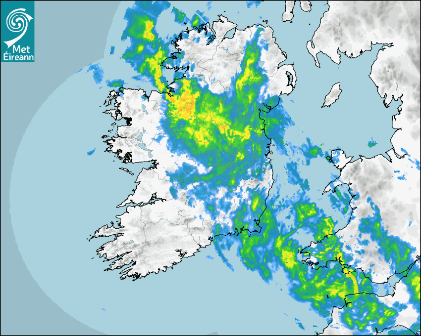 Ground Clutter may appear (South Co. Dublin), bright bands and spokes may also be present in images. They are artefacts (false echoes) of rainfall radar systems and should be ignored. Further information on Radar here
