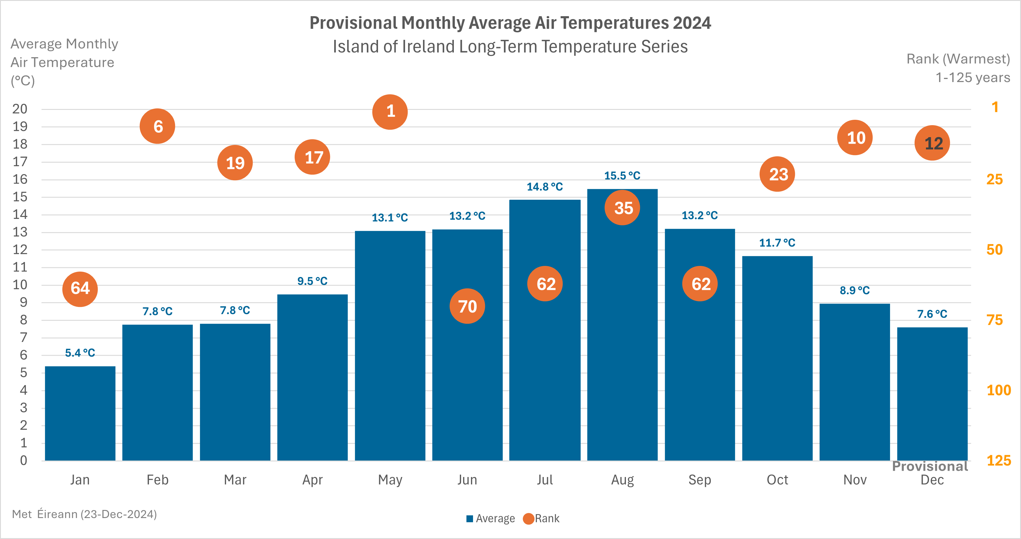 December 2024 is expected to be around the 12th/13th warmest December on record (length 125 years), and average around 7.6 °C. Most months in 2024 were cooler than their respective months in 2023, therefore 2024 is not the warmest-year for Ireland and 2023 remains Ireland’s warmest-year on record. However, 2024 will be among the warmest years on record for Ireland.